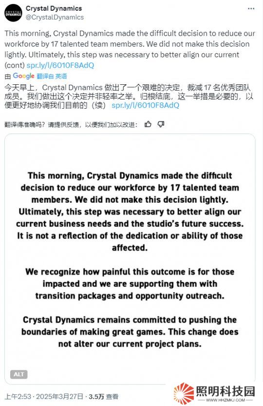 今日,动作冒险游戏《古墓丽影》开发商水晶动力(Crystal Dynamics )官方,发布了裁员公告。公告中表示: