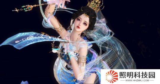 女款【即色游玄】似乎是将九天银河化作衣裙,从深邃蓝色渐变到浅白色的设计颇为别致,背后的皎洁玉盘、随风摇曳的薄纱,以及华丽精致的饰品组合在一起,将神圣感打满了全屏,以至于玩家发出了“自此不敢见观音”的感叹。