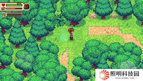 在没有武器的情况下路上的灌木丛会挡住你的去路,有武器时只需点击攻击键就可以击毁灌木丛,在击毁灌木丛后有几率掉落补血的红心和金币,屏幕左上角绿色条是生命值,底下的黄色条是经验值,击杀怪物后获得大量经验值升级,在森林中如果遇到宝箱一定要面对宝箱点击攻击键打开宝箱,可能会获得物品。