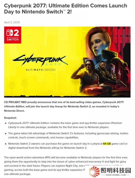 任天堂最近还确认,部分Switch 2的新游戏卡不会直接包含游戏本体,而是提供一个下载密钥。不过《赛博朋克2077》不在此列。