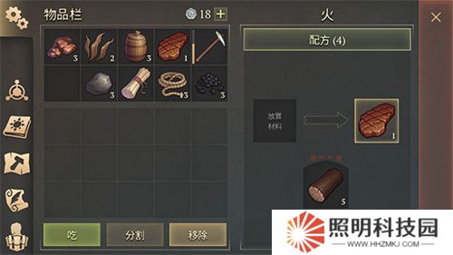 6、在火堆的操作界面中,添加生肉和木料作为燃料,然后等待烹饪过程完成,即可获得美味的烤肉。