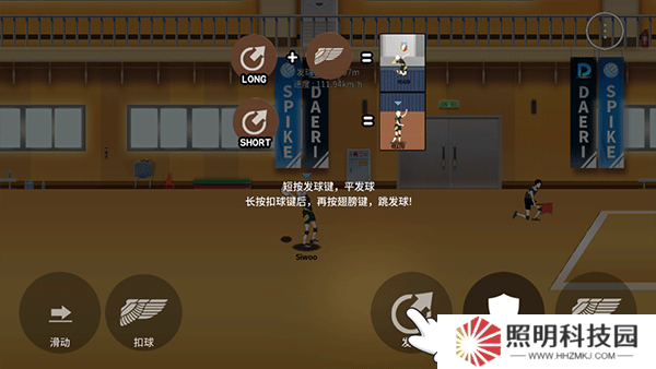 5、玩家可以根据站位进行选择发球,长按发球键是平发球,长按扣球键再按翅膀键则是跳发球。