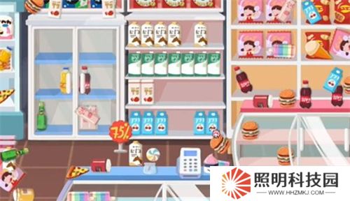 2、注意最左边的冰箱和旁边的柜子上有这中已经放好了的零食,跟着把一样的零食放好就可以了。